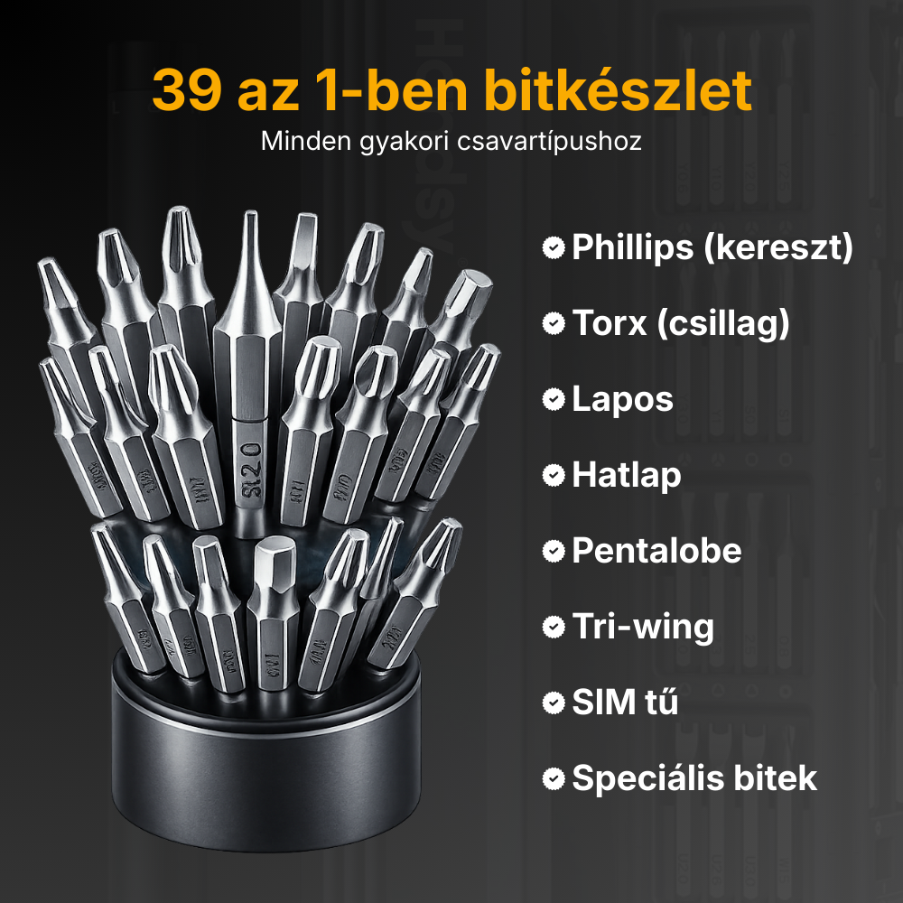 A készlet egy 39 az 1-ben bitkészletet tartalmaz, amely lefedi a leggyakrabban használt csavartípusokat. Elektronikai eszközökhöz és általános szerelési feladatokhoz egyaránt megfelelő.